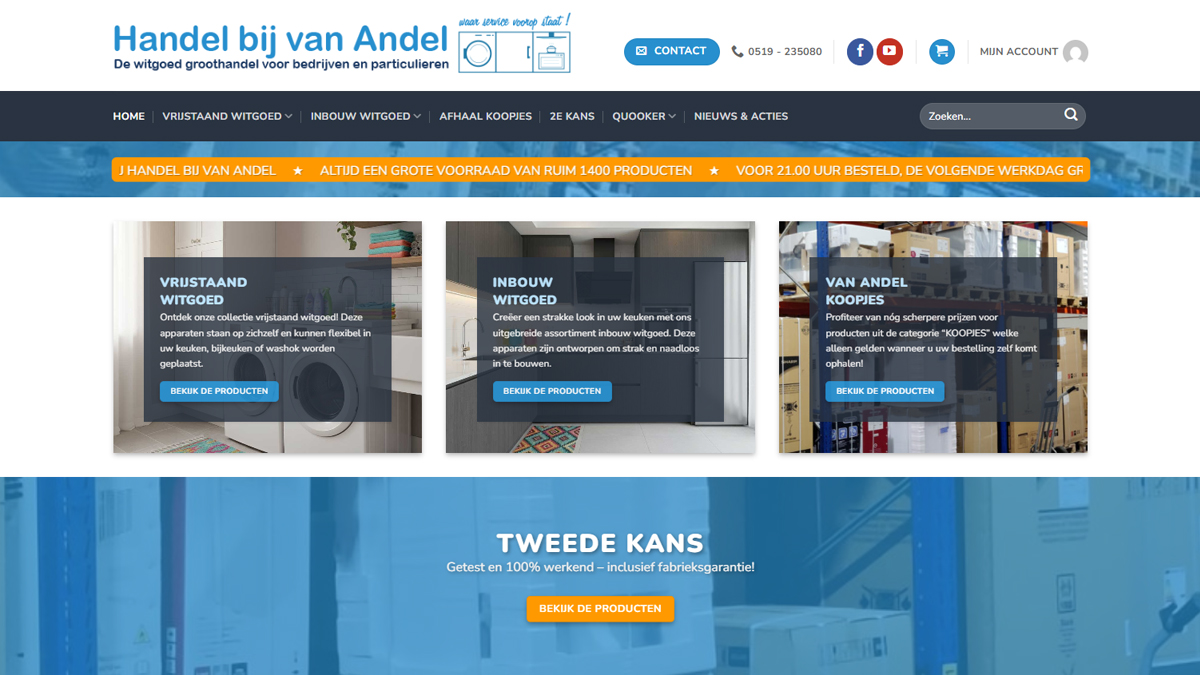 Zéér uitgebreide bedrijfswebsite + webwinkel van een groothandel in witgoedproducten. Deze website is gemaakt in WordPress. De online verkoopmogelijkheden (webshop) gaat via de Woocommerce plugin. Een complete e-commerce module welke speciaal is ontwikkeld voor WordPress.